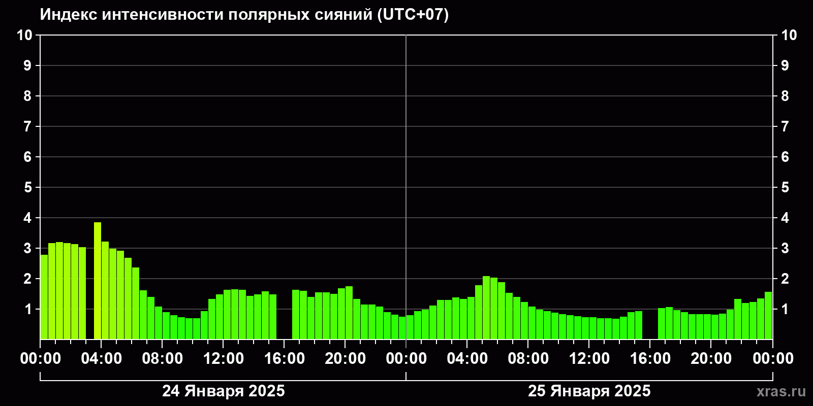 Изменения индекса интенсивности полярных сияний с 2025-01-24 по 2025-01-25 по местному времени