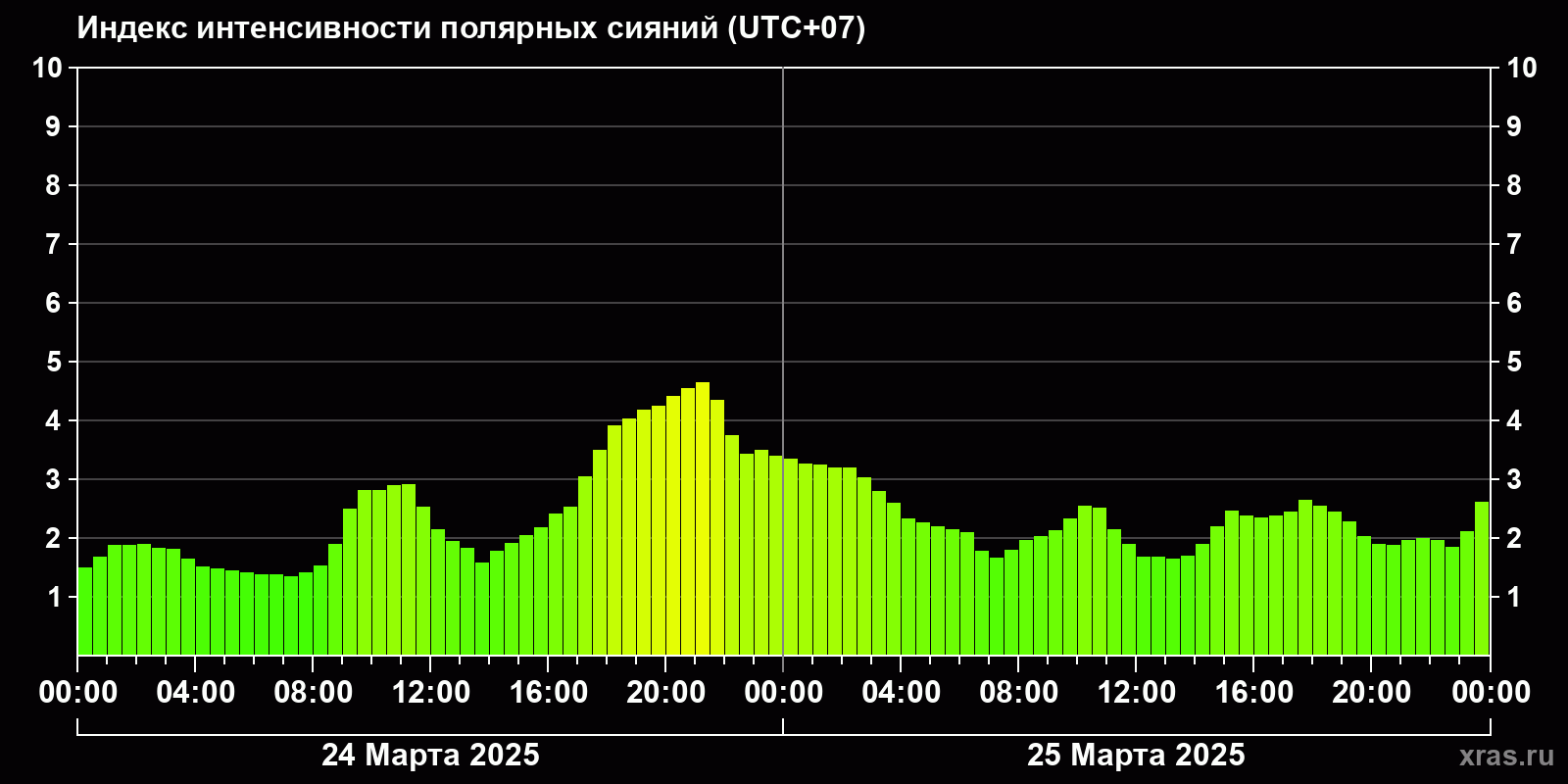 Изменения индекса интенсивности полярных сияний с 2025-03-24 по 2025-03-25 по местному времени
