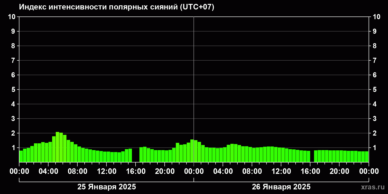Изменения индекса интенсивности полярных сияний с 2025-01-25 по 2025-01-26 по местному времени