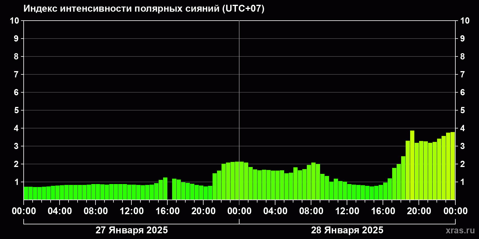 Изменения индекса интенсивности полярных сияний с 2025-01-27 по 2025-01-28 по местному времени