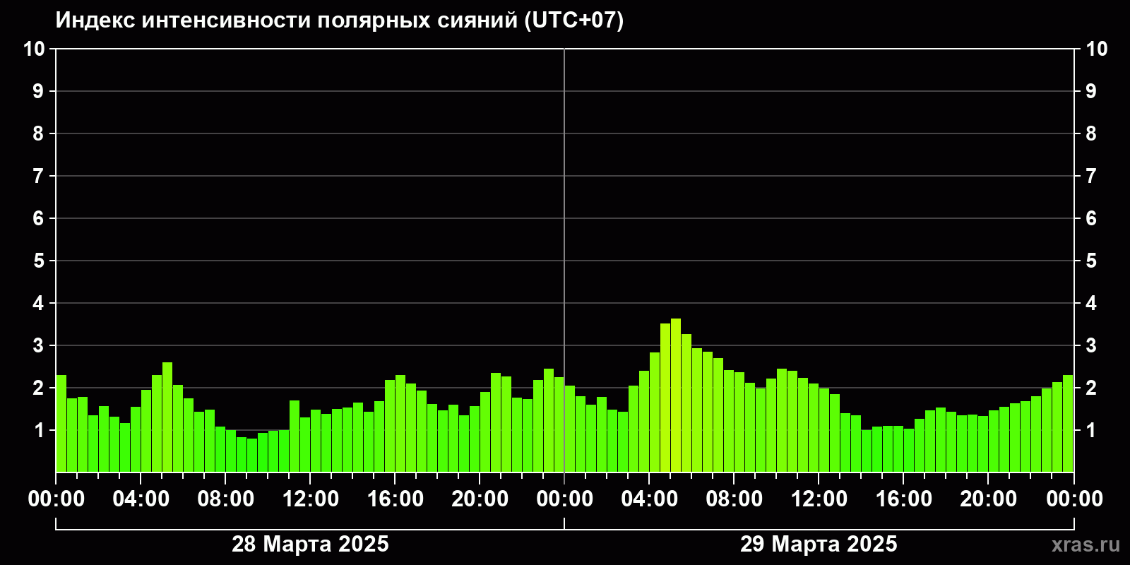 Изменения индекса интенсивности полярных сияний с 2025-03-28 по 2025-03-29 по местному времени