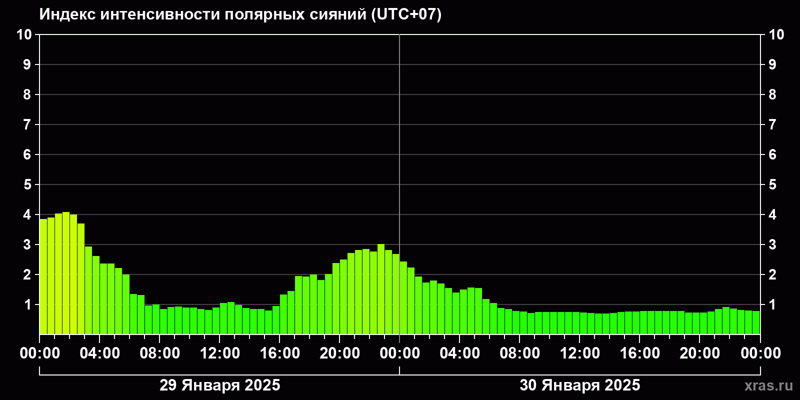 Изменения индекса интенсивности полярных сияний с 2025-01-29 по 2025-01-30 по местному времени