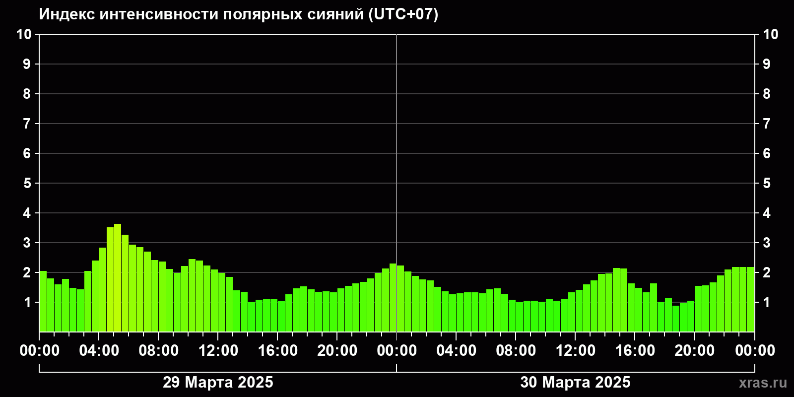 Изменения индекса интенсивности полярных сияний с 2025-03-29 по 2025-03-30 по местному времени