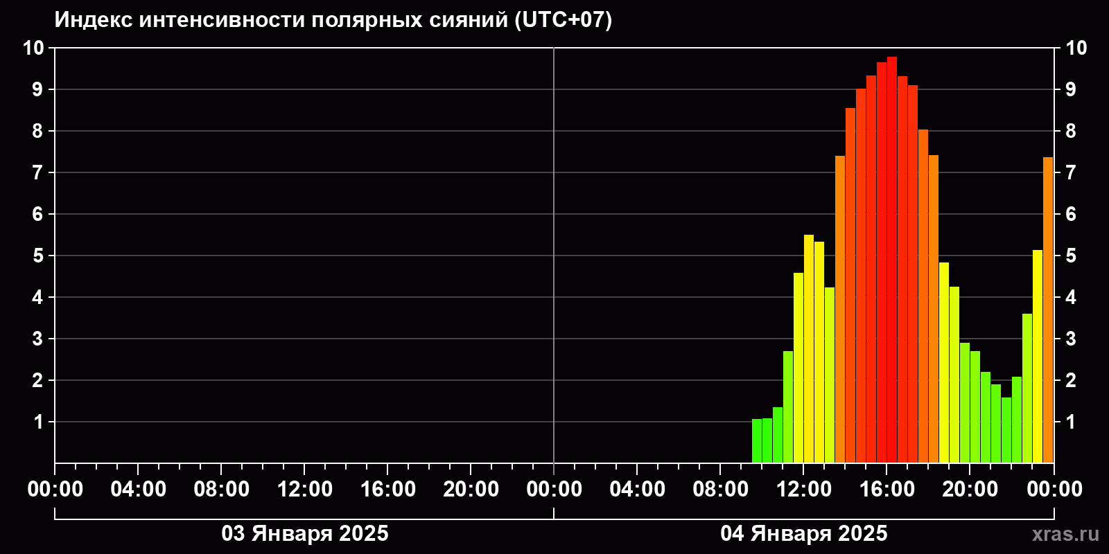 Изменения индекса интенсивности полярных сияний с 2025-01-03 по 2025-01-04 по местному времени
