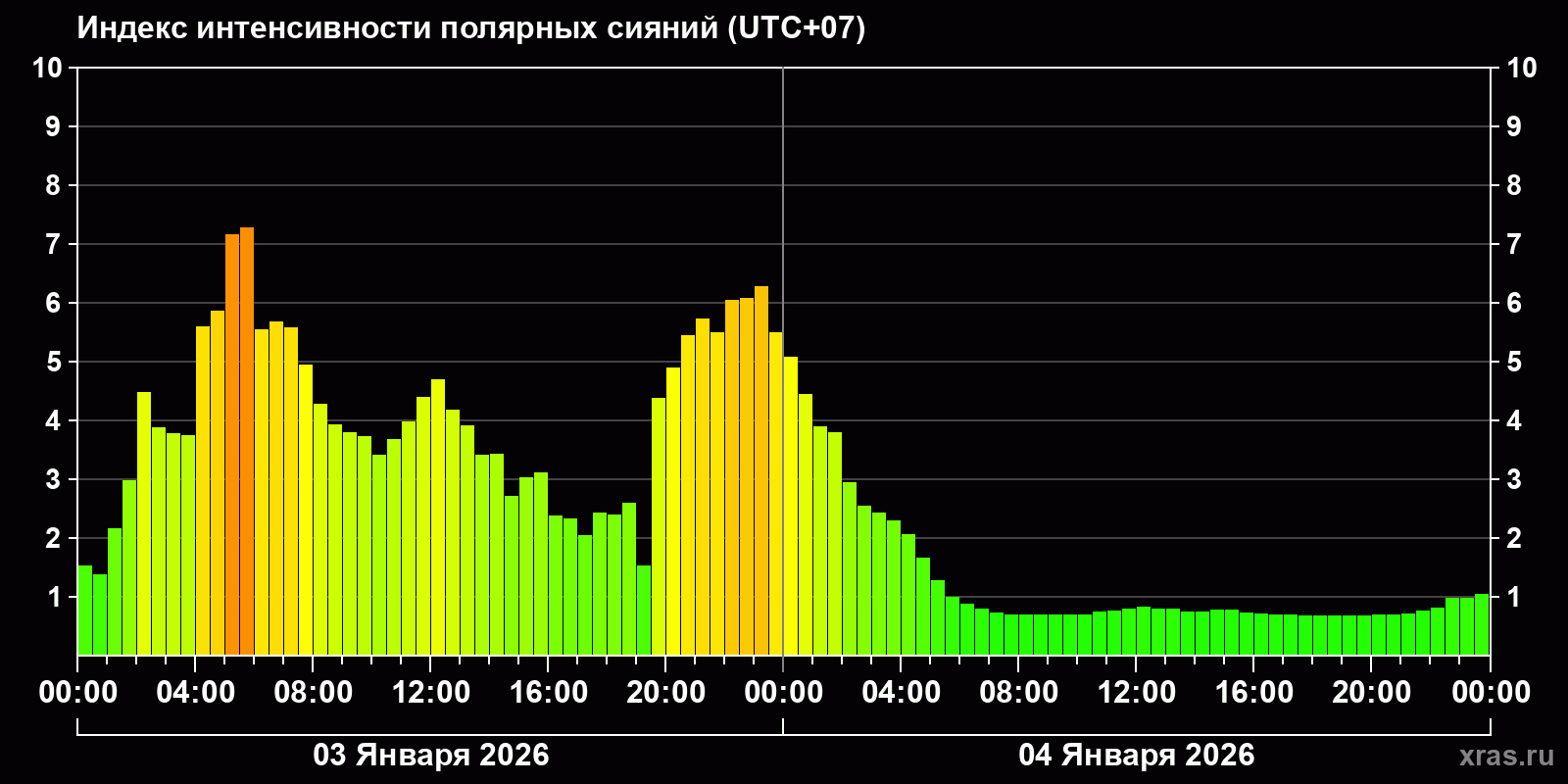 Изменения индекса интенсивности полярных сияний с 2026-01-03 по 2026-01-04 по местному времени