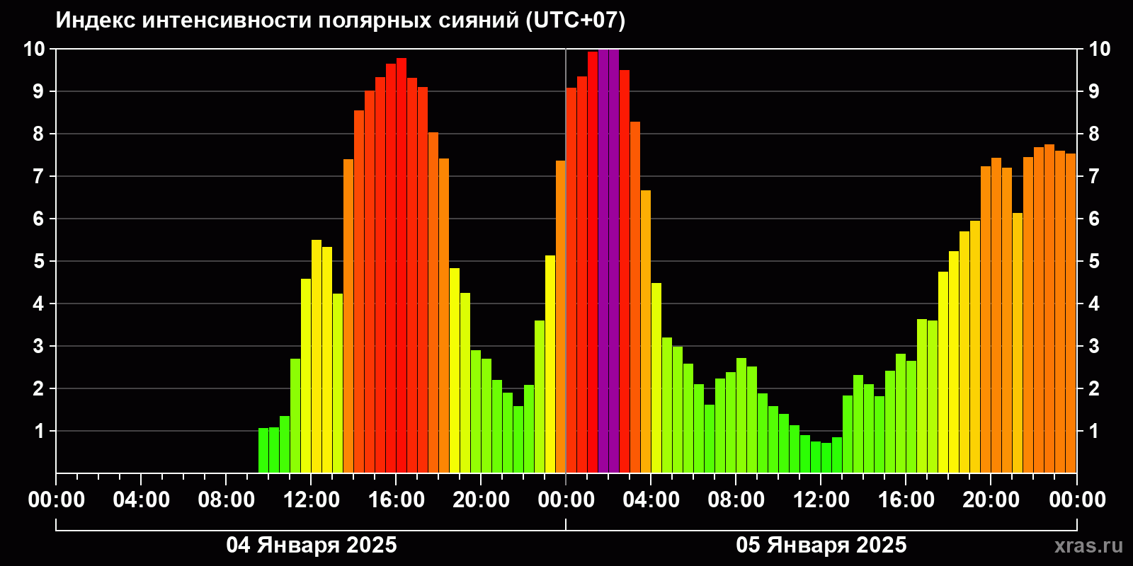 Изменения индекса интенсивности полярных сияний с 2025-01-04 по 2025-01-05 по местному времени
