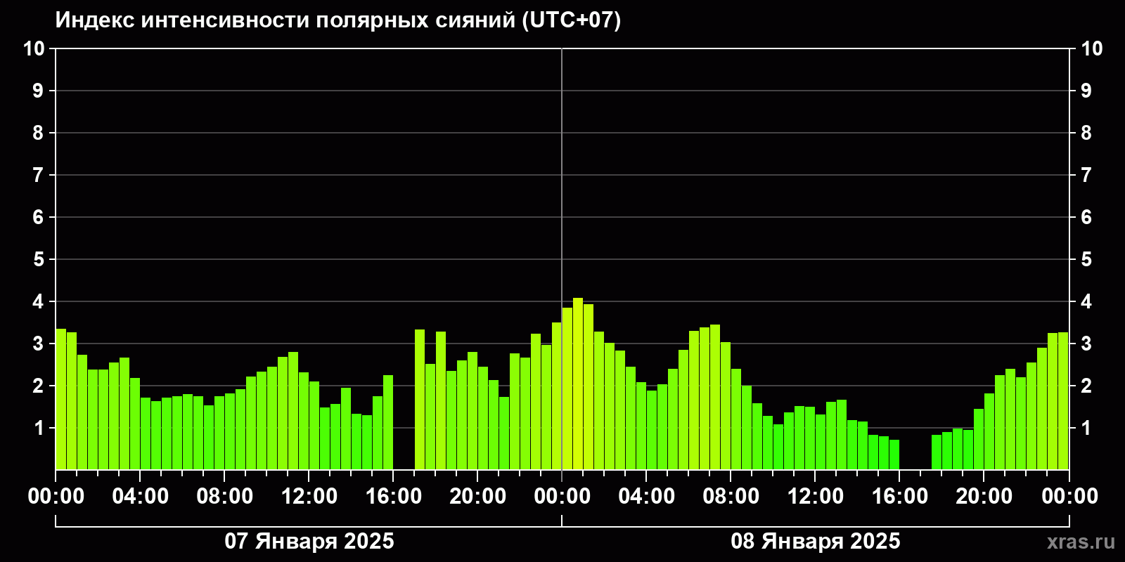 Изменения индекса интенсивности полярных сияний с 2025-01-07 по 2025-01-08 по местному времени