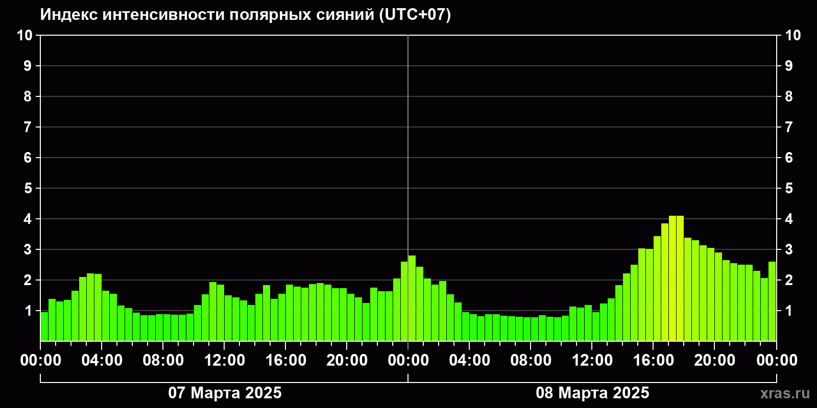 Изменения индекса интенсивности полярных сияний с 2025-03-07 по 2025-03-08 по местному времени
