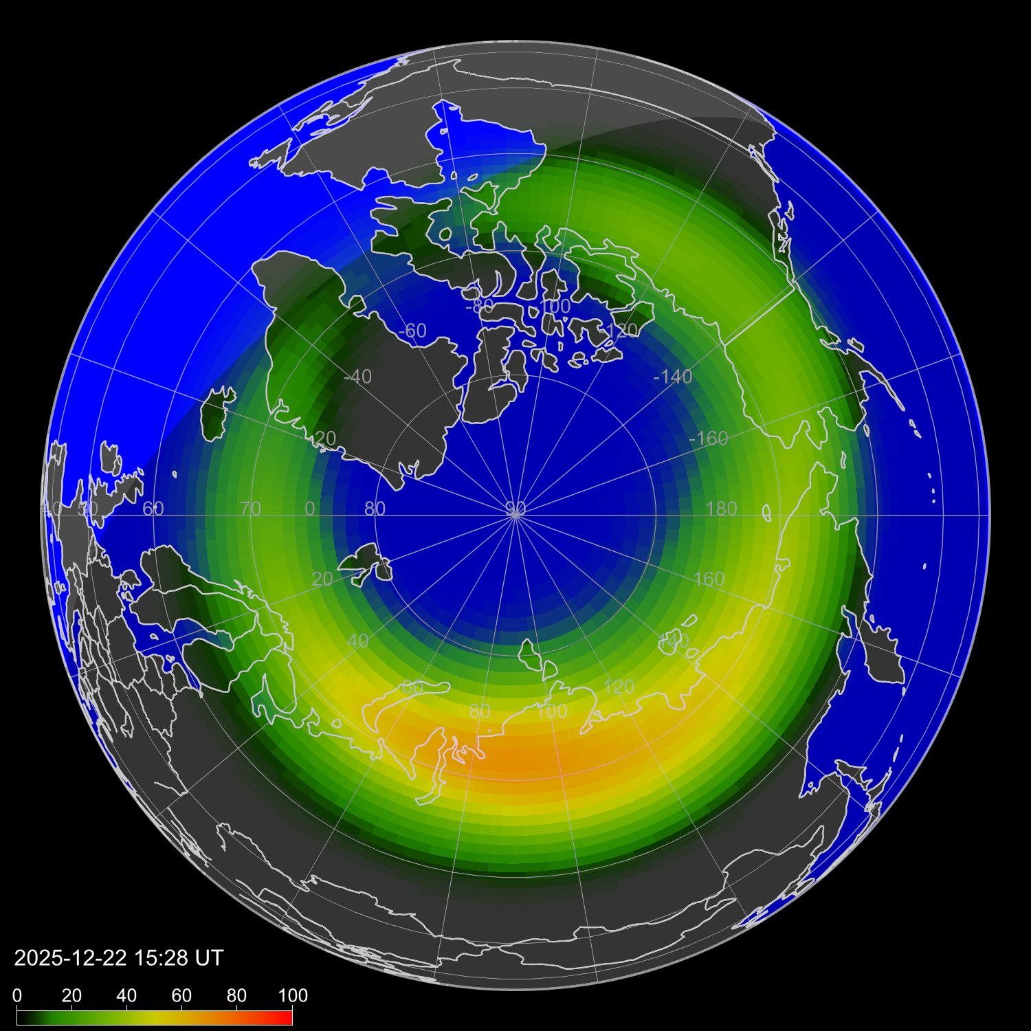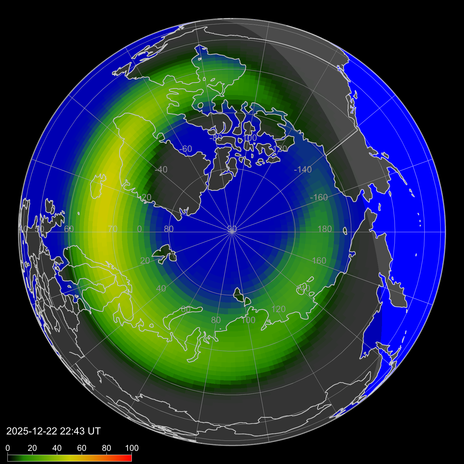 Изменения и часовой прогноз индекса интенсивности полярных сияний с 2025-12-21 по 2025-12-22