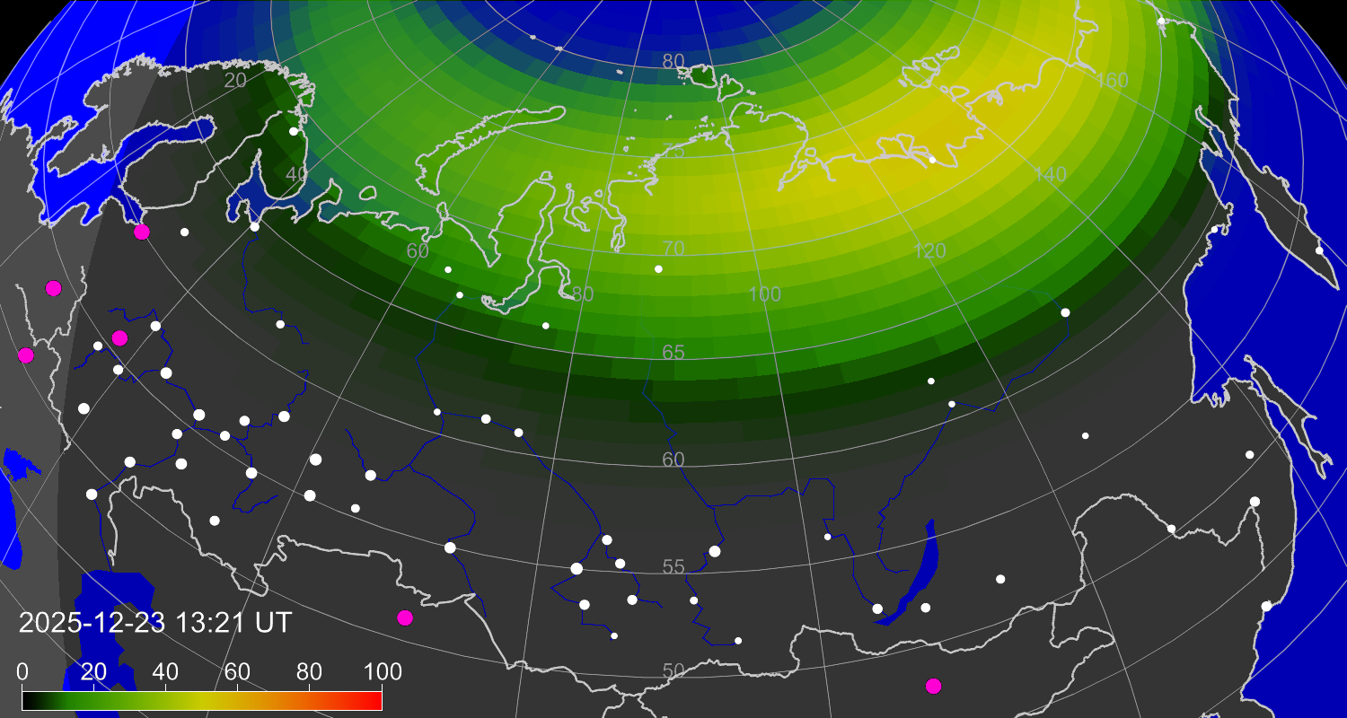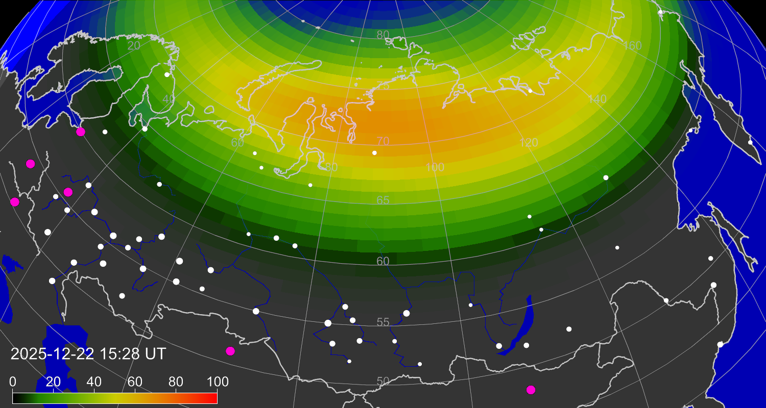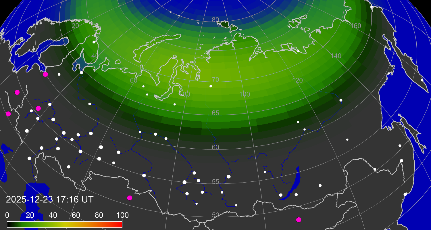 Индекс интенсивности полярных сияний и теоретически возможная широта наблюдений для ночного времени в восточном полушарии
