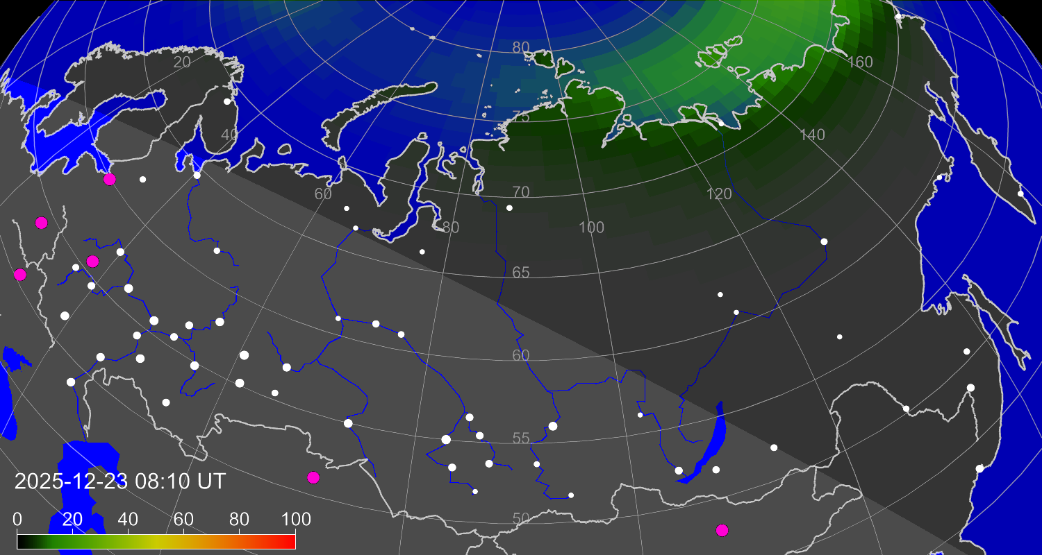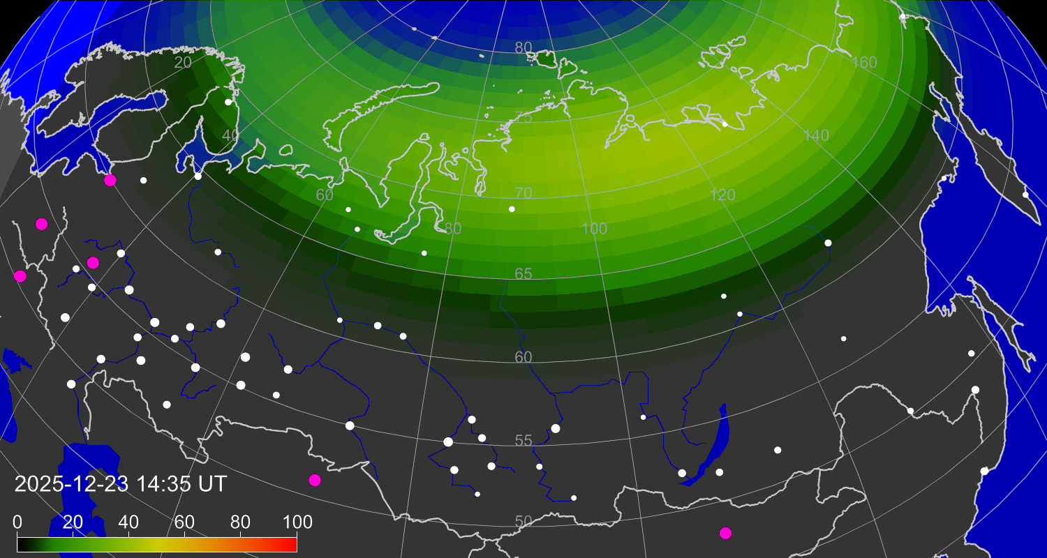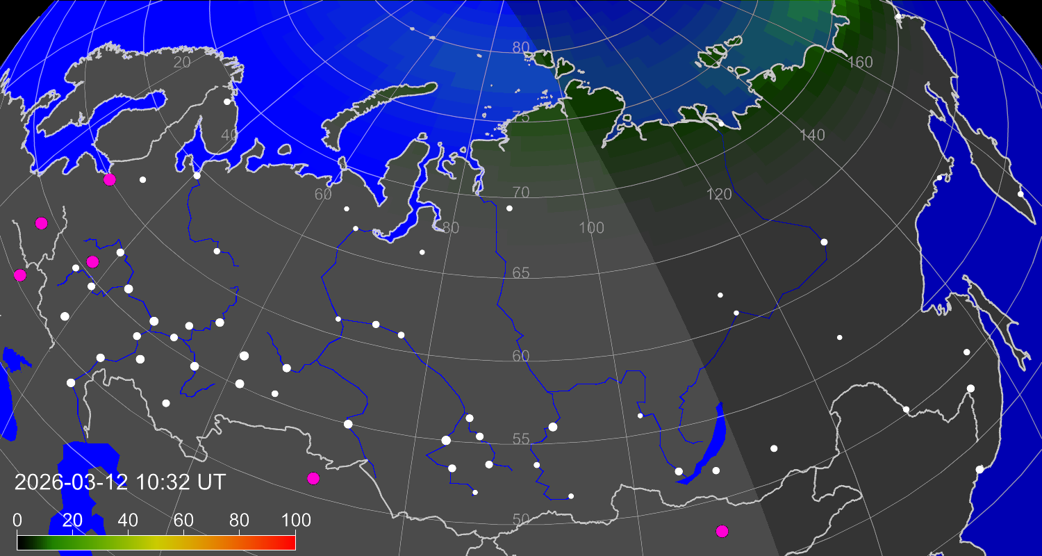 Индекс интенсивности полярных сияний и теоретически возможная широта наблюдений для ночного времени в восточном полушарии