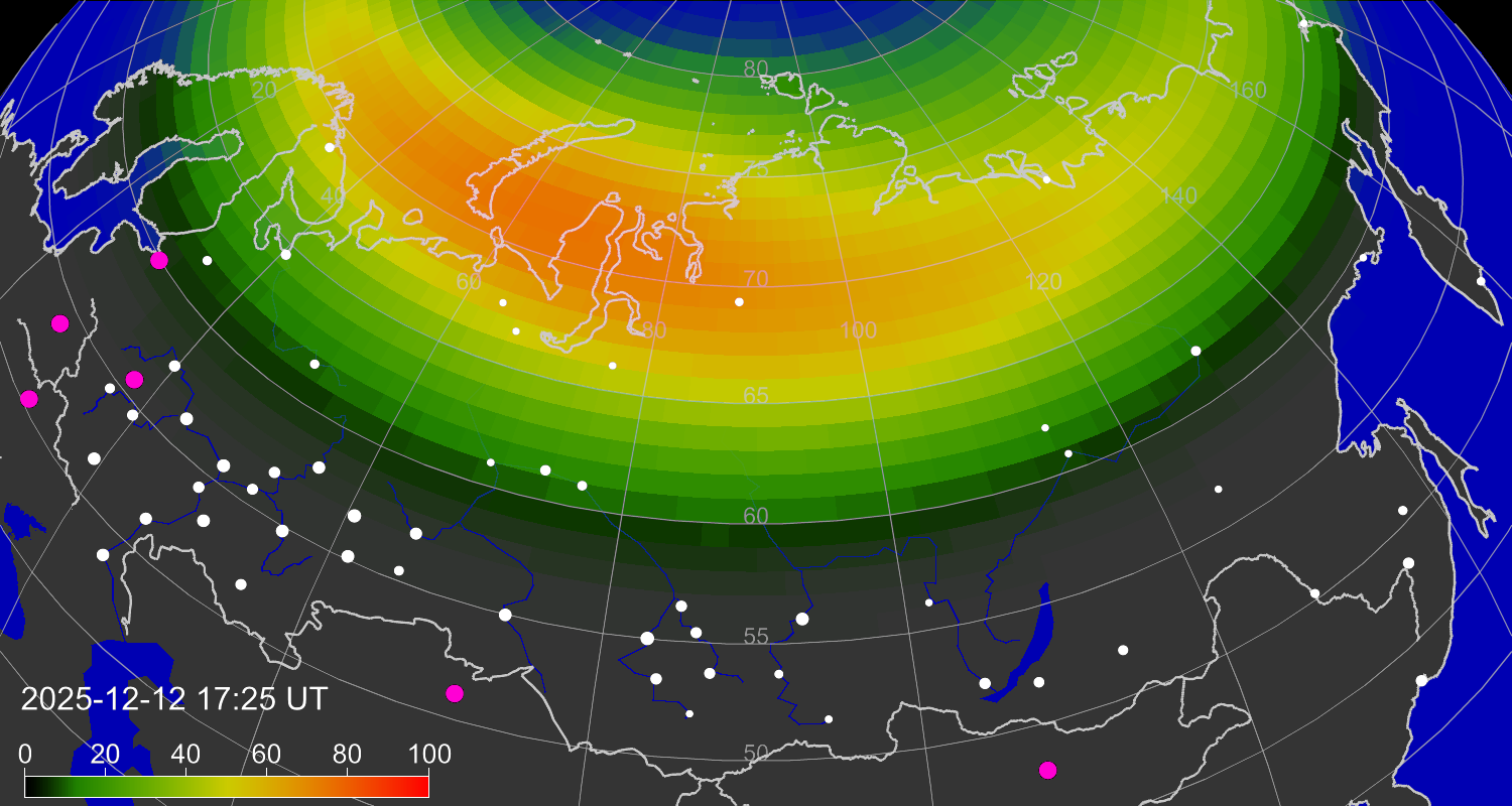 Изменения и часовой прогноз индекса интенсивности полярных сияний с 2025-12-11 по 2025-12-12