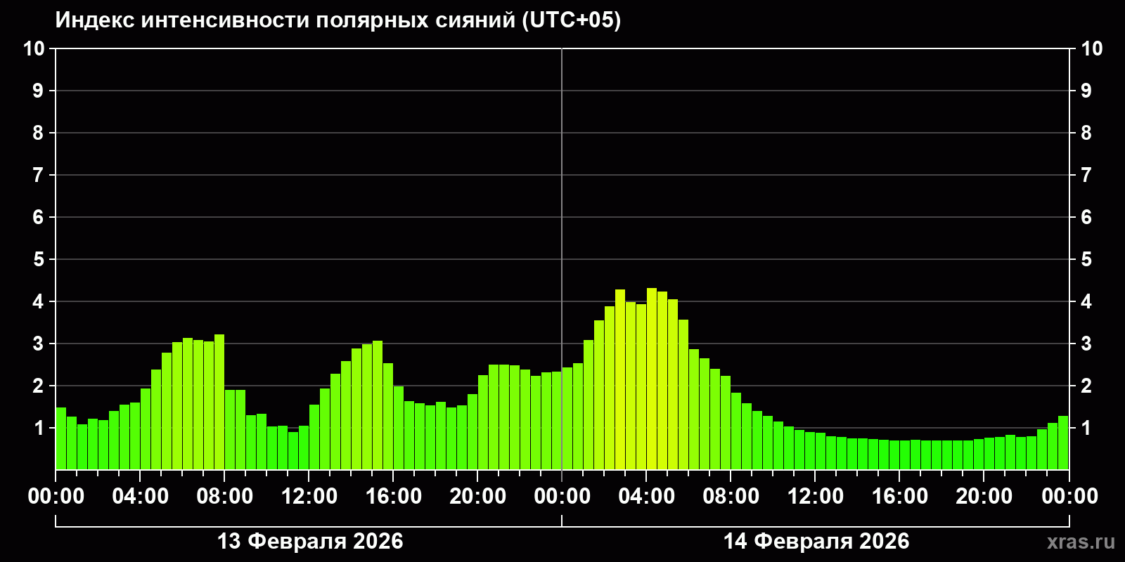 Изменения индекса интенсивности полярных сияний с 2026-02-13 по 2026-02-14 по местному времени