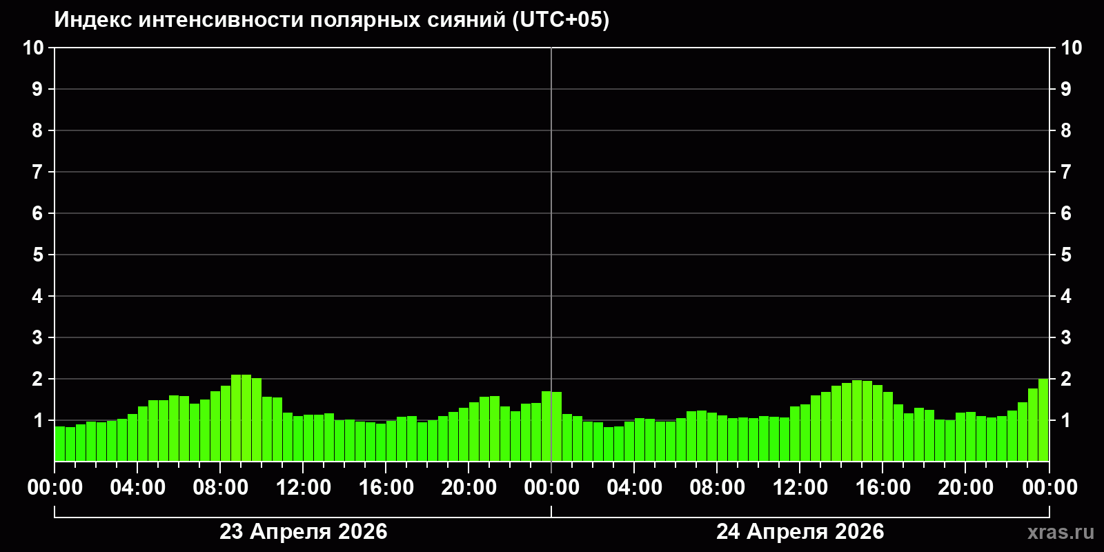 Изменения индекса интенсивности полярных сияний с 2026-04-23 по 2026-04-24 по местному времени