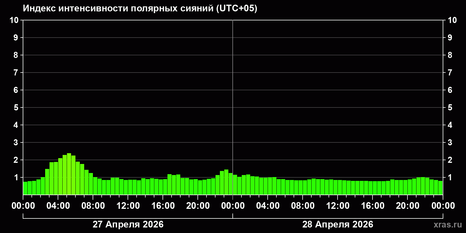 Изменения индекса интенсивности полярных сияний с 2026-04-27 по 2026-04-28 по местному времени