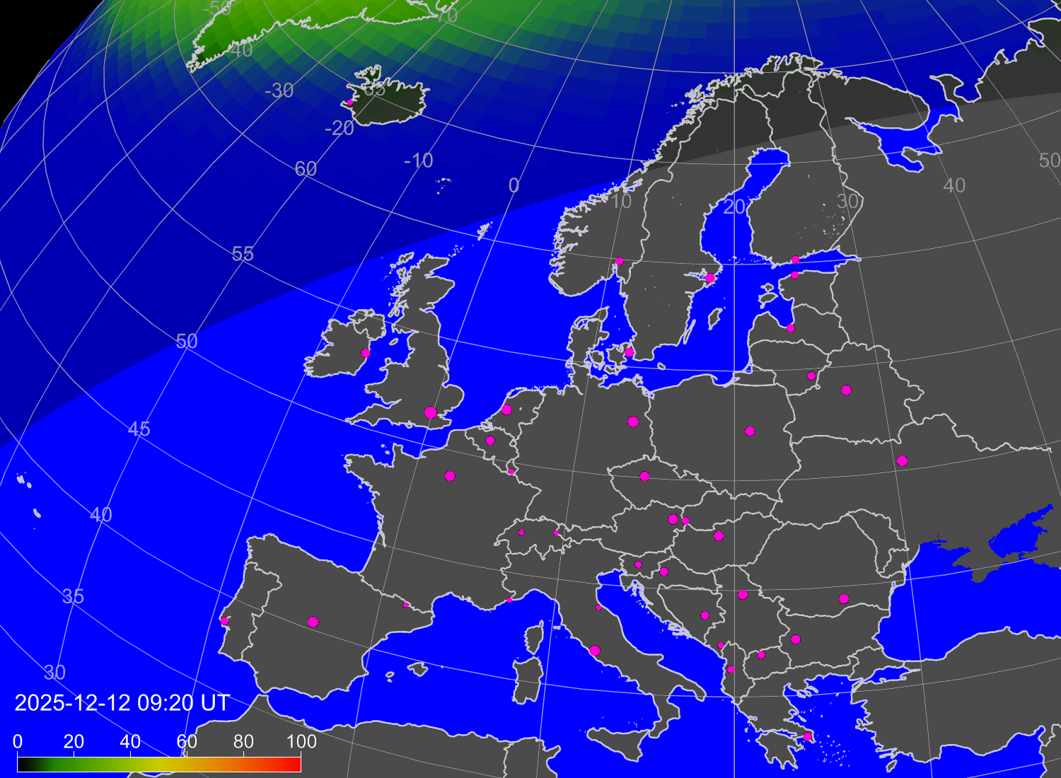 Вероятность полярных сияний в городах Европы