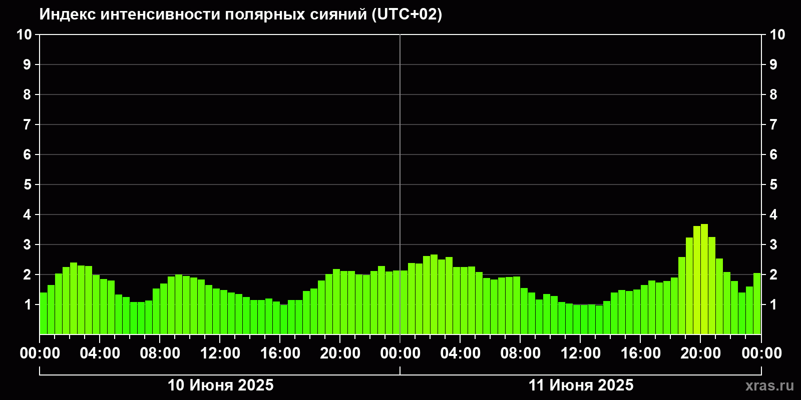 Изменения индекса интенсивности полярных сияний с 2025-06-11 по 2025-06-12 по местному времени