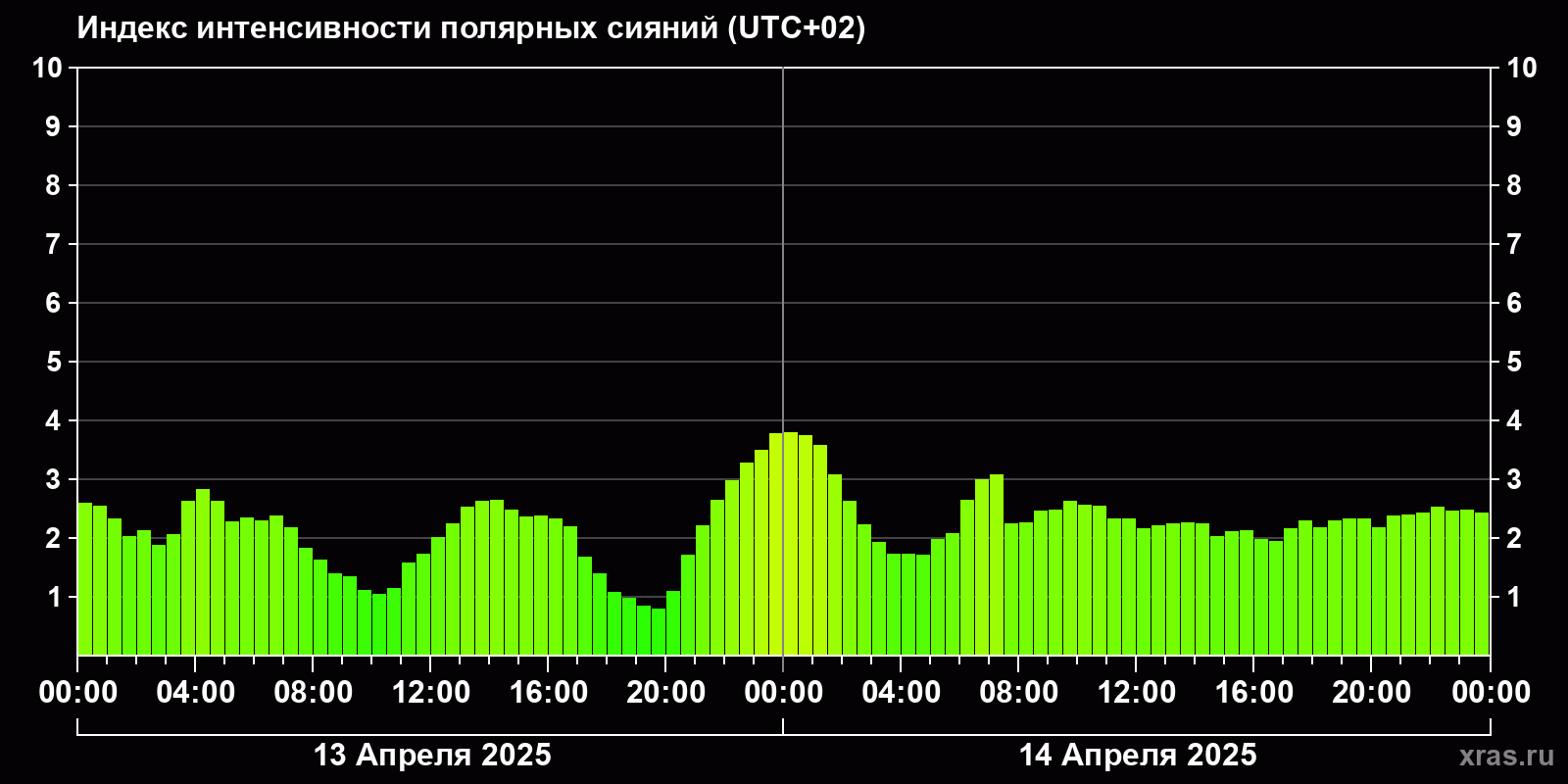 Изменения индекса интенсивности полярных сияний с 2025-04-14 по 2025-04-15 по местному времени