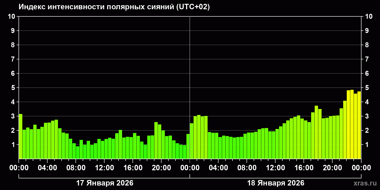 Изменения индекса интенсивности полярных сияний с 2026-01-17 по 2026-01-18 по местному времени