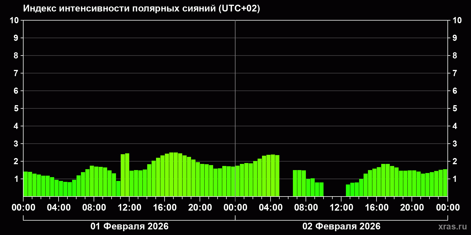 Изменения индекса интенсивности полярных сияний с 2026-02-01 по 2026-02-02 по местному времени
