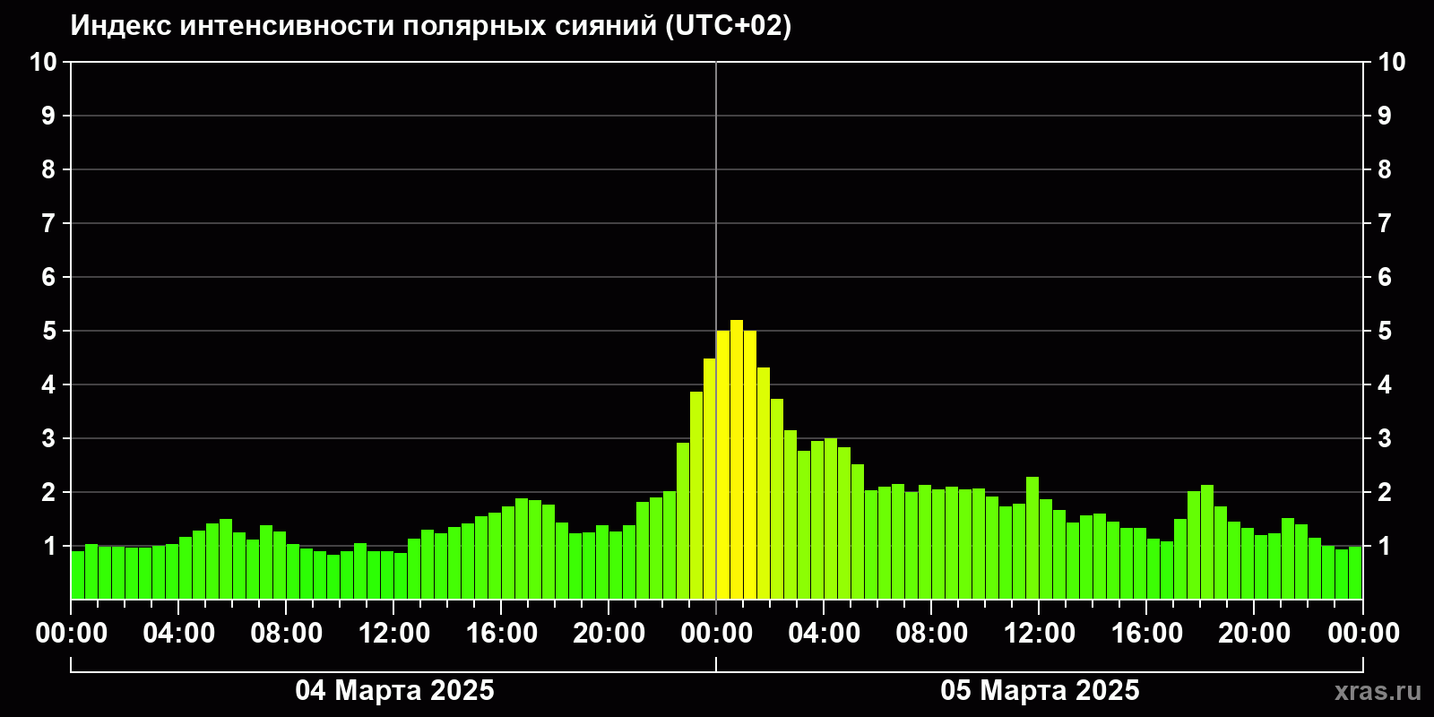 Изменения индекса интенсивности полярных сияний с 2025-03-04 по 2025-03-05 по местному времени