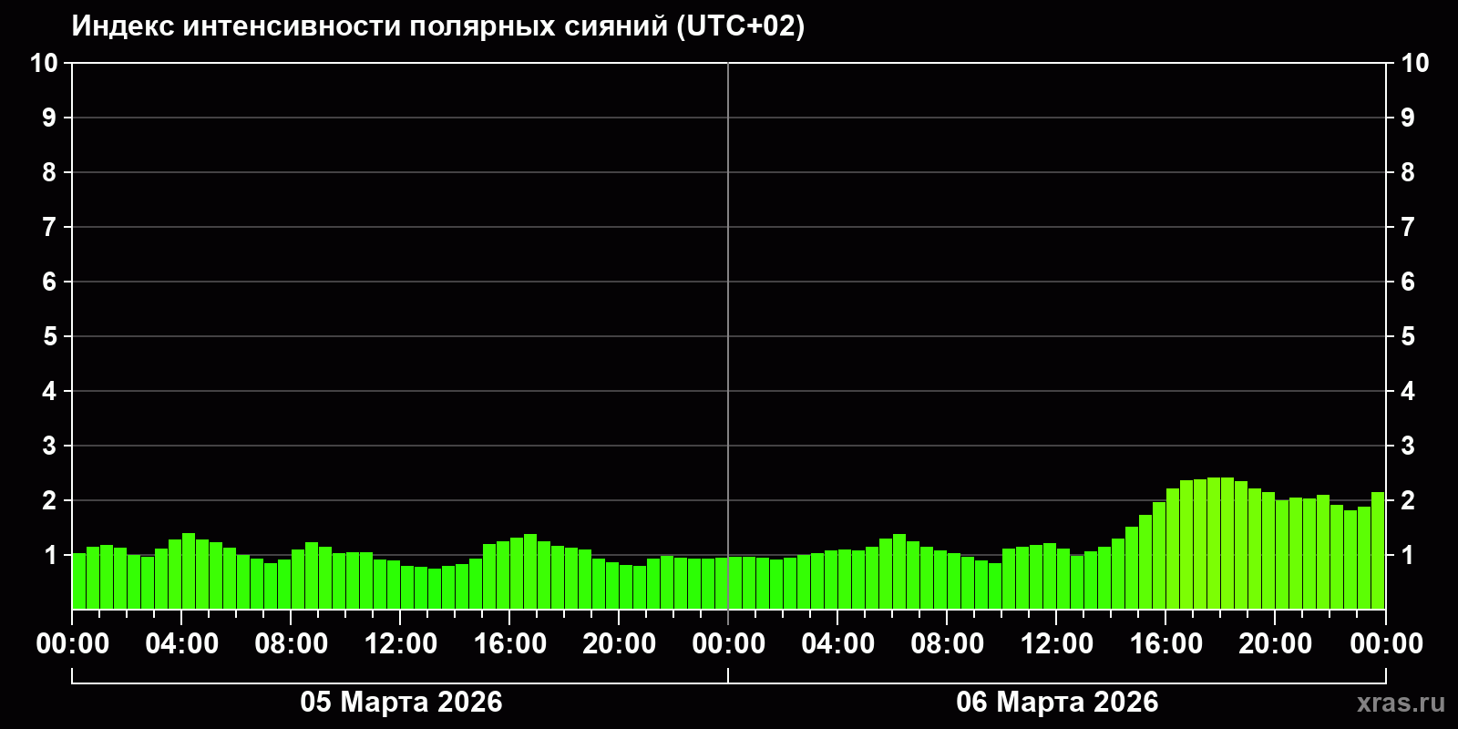 Изменения индекса интенсивности полярных сияний с 2026-03-05 по 2026-03-06 по местному времени