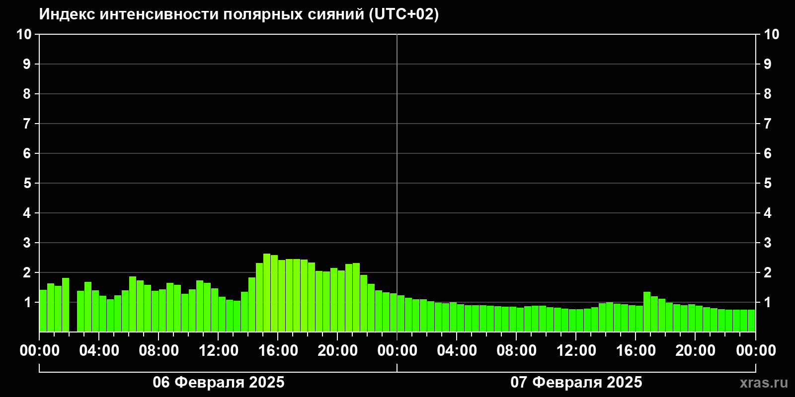 Изменения индекса интенсивности полярных сияний с 2025-02-06 по 2025-02-07 по местному времени