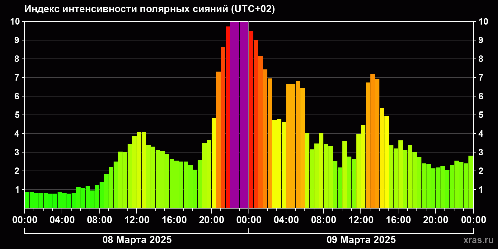 Изменения индекса интенсивности полярных сияний с 2025-03-08 по 2025-03-09 по местному времени