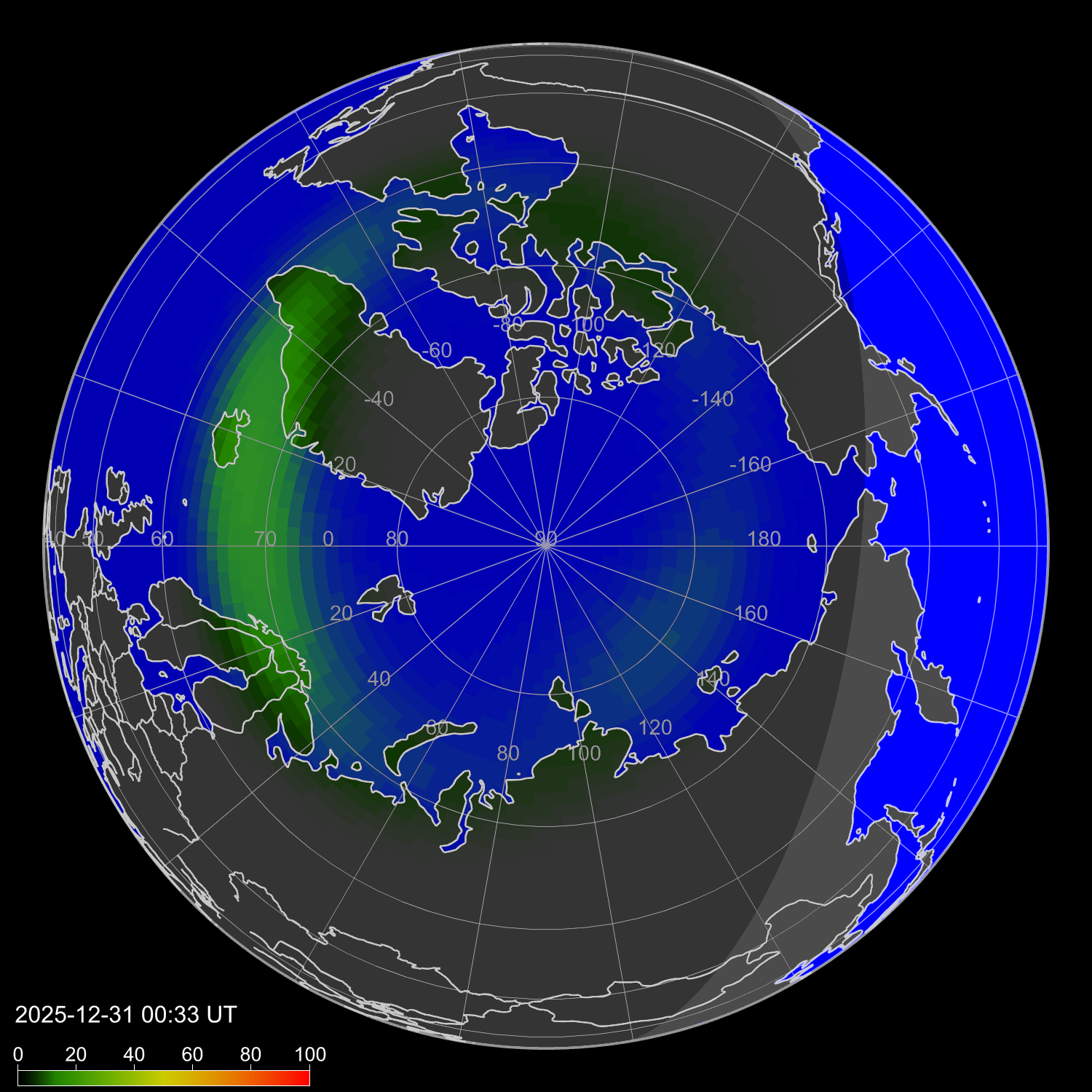 Изменения и часовой прогноз индекса интенсивности полярных сияний с 2025-12-31 по 2026-01-01