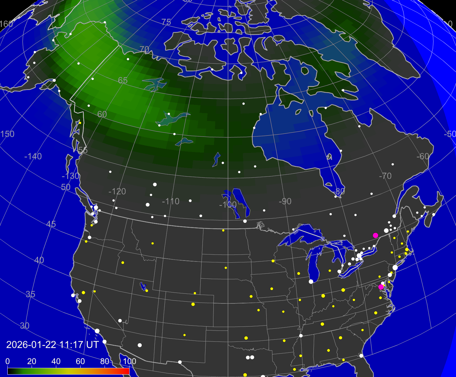 Вероятность полярных сияний в городах США