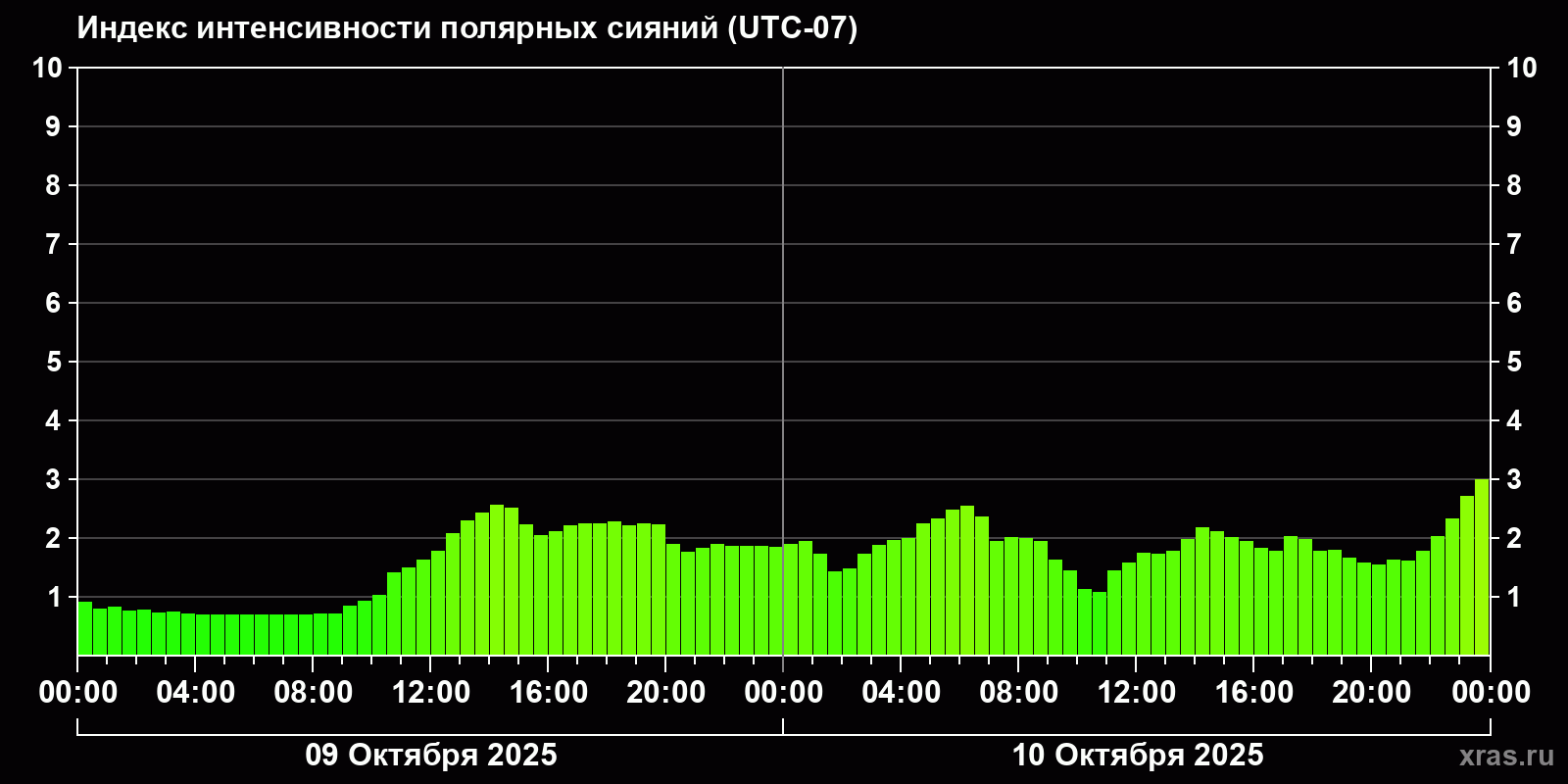 Изменения индекса интенсивности полярных сияний с 2025-10-09 по 2025-10-10 по местному времени