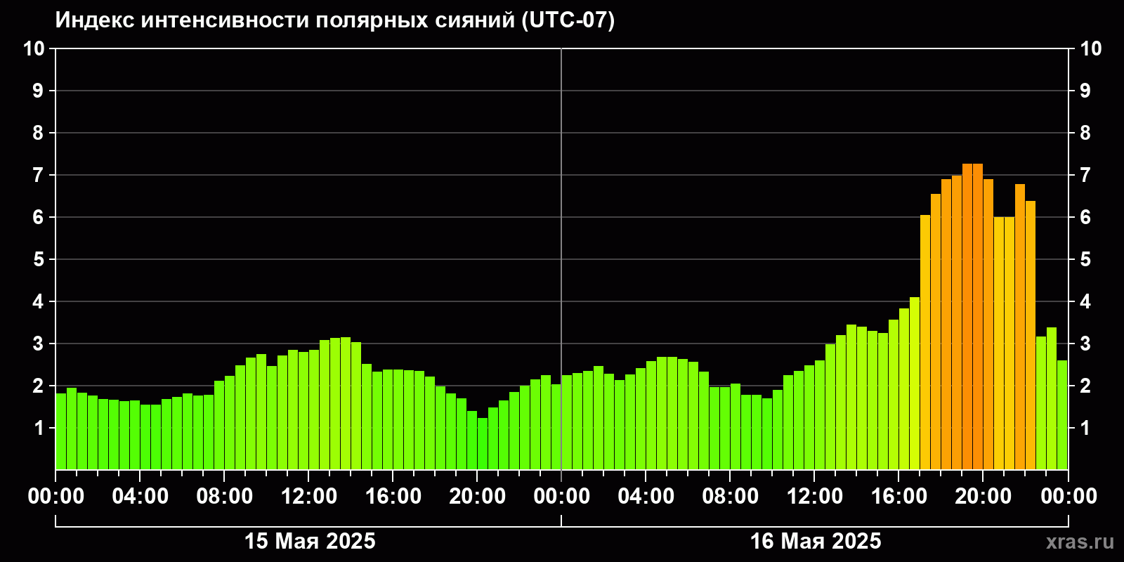 Изменения индекса интенсивности полярных сияний с 2025-05-15 по 2025-05-16 по местному времени