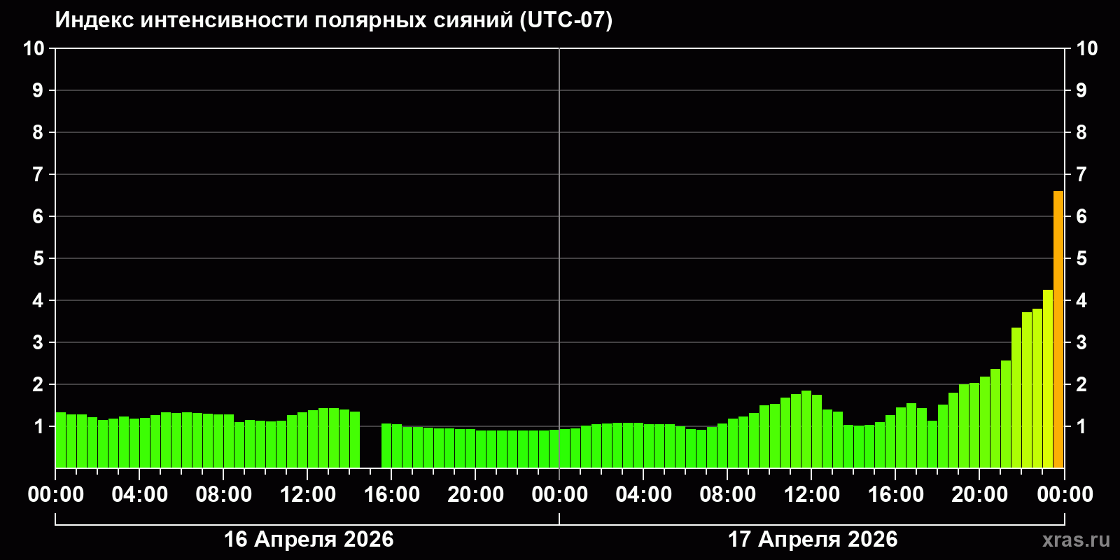 Изменения индекса интенсивности полярных сияний с 2026-04-16 по 2026-04-17 по местному времени