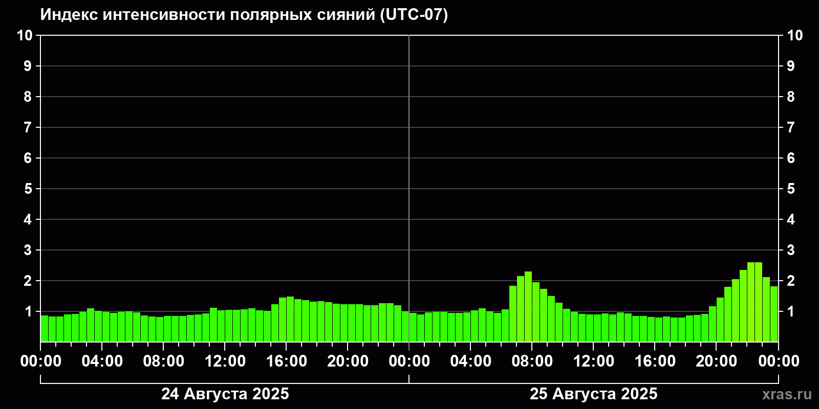 Изменения индекса интенсивности полярных сияний с 2025-08-24 по 2025-08-25 по местному времени