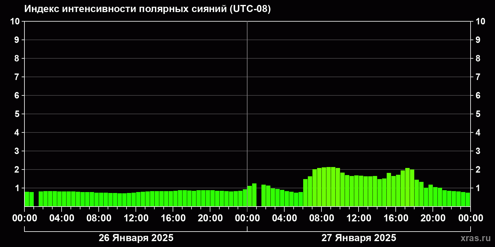 Изменения индекса интенсивности полярных сияний с 2025-01-26 по 2025-01-27 по местному времени