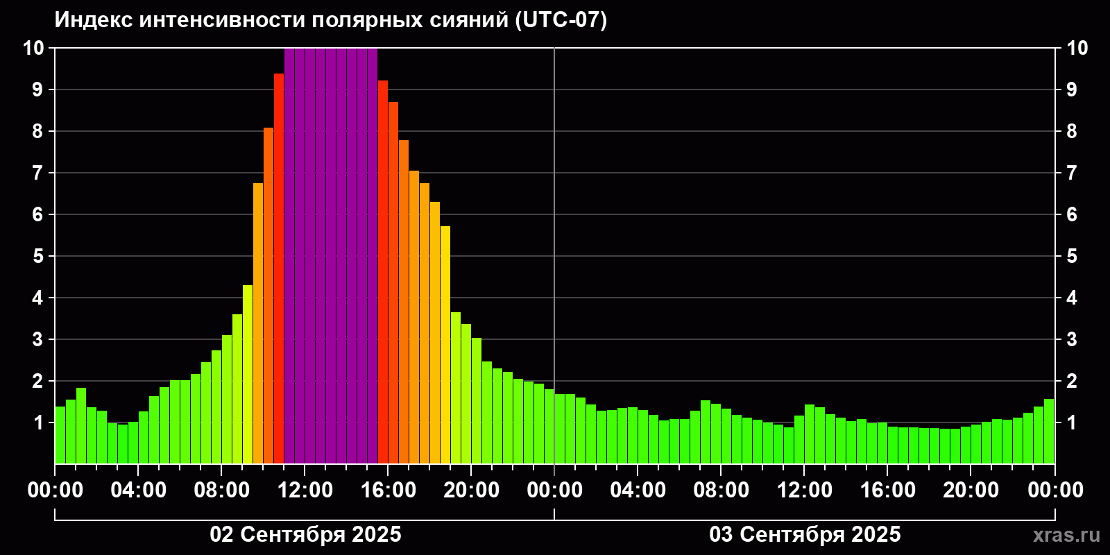 Изменения индекса интенсивности полярных сияний с 2025-09-02 по 2025-09-03 по местному времени