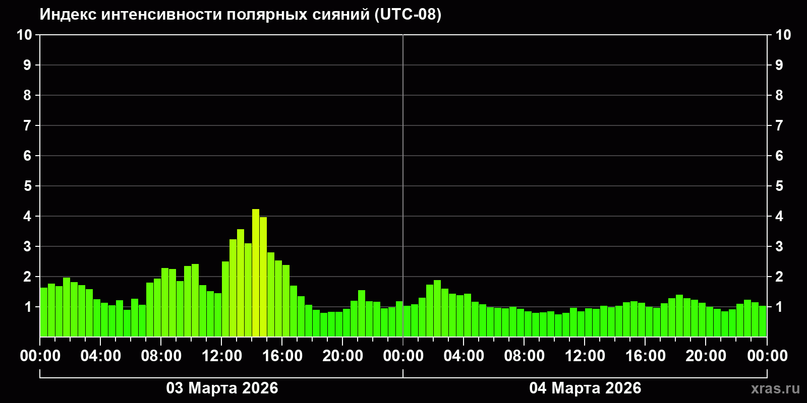 Изменения индекса интенсивности полярных сияний с 2026-03-03 по 2026-03-04 по местному времени