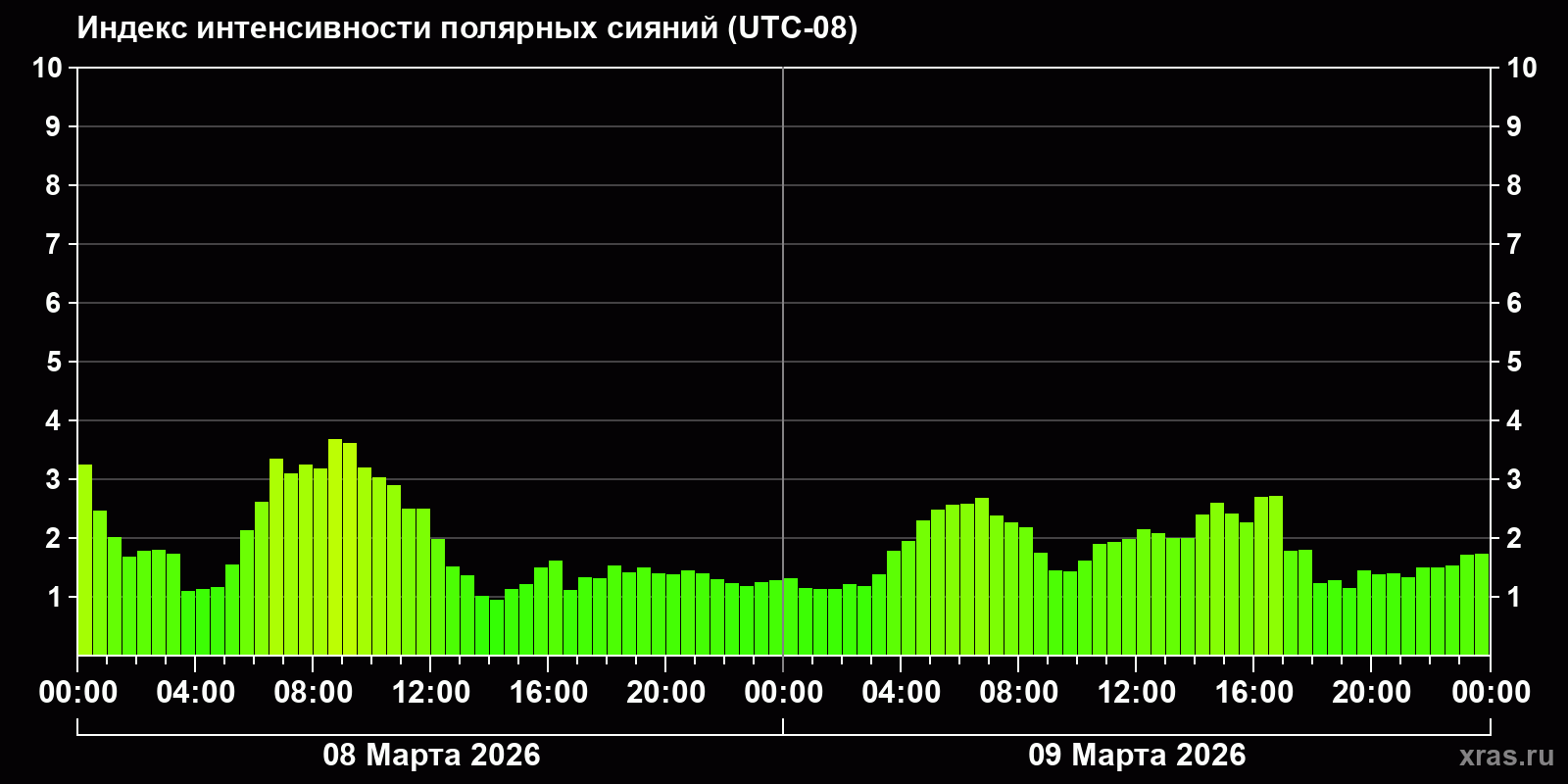 Изменения индекса интенсивности полярных сияний с 2026-03-08 по 2026-03-09 по местному времени