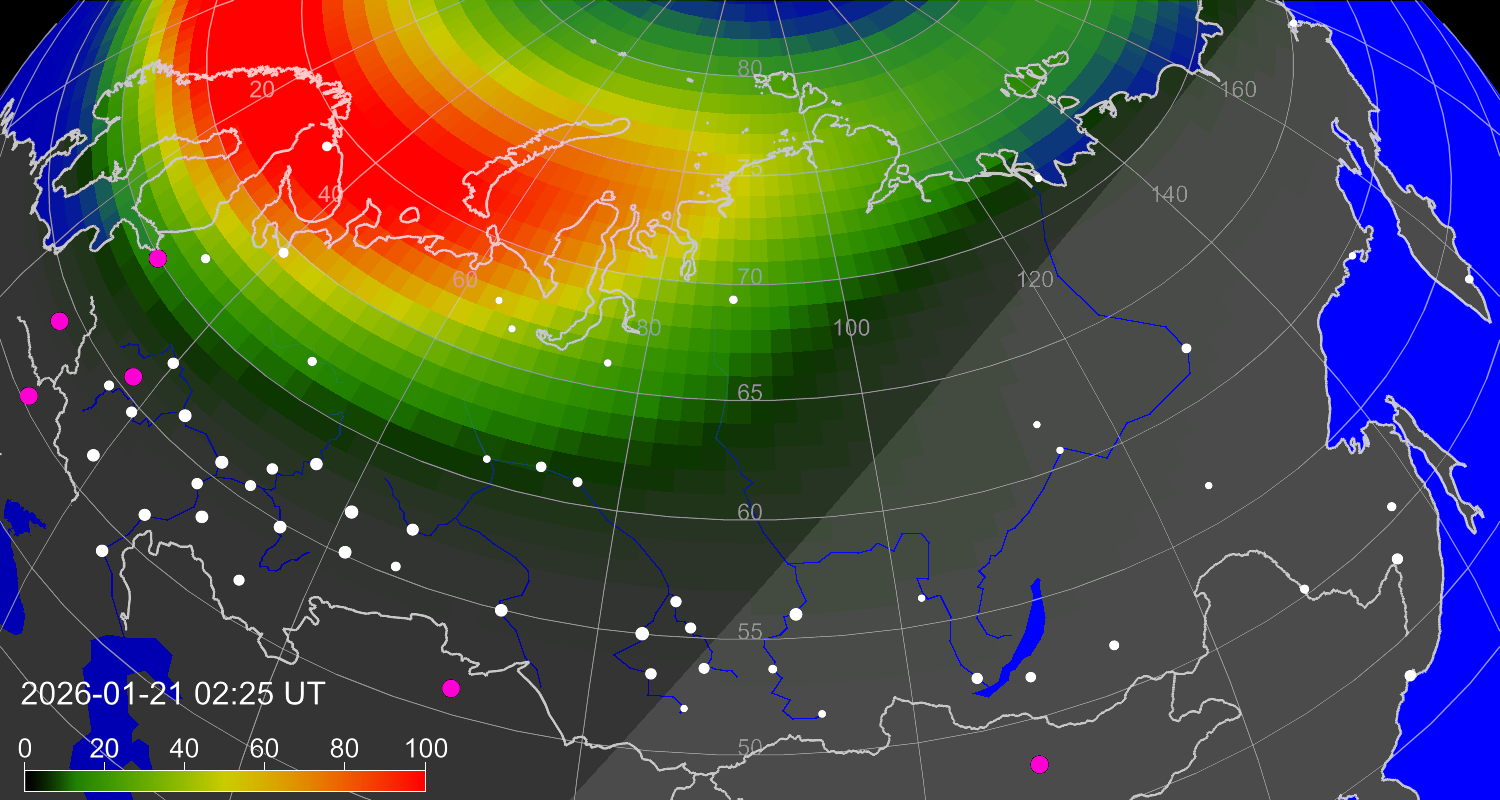 Изменения и часовой прогноз индекса интенсивности полярных сияний с 2026-01-21 по 2026-01-22