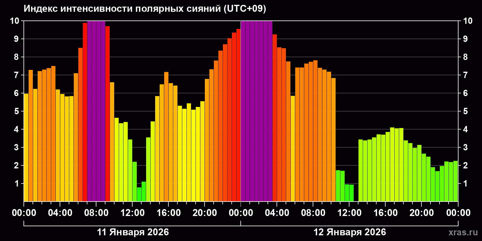 Изменения индекса интенсивности полярных сияний с 2026-01-11 по 2026-01-12 по местному времени