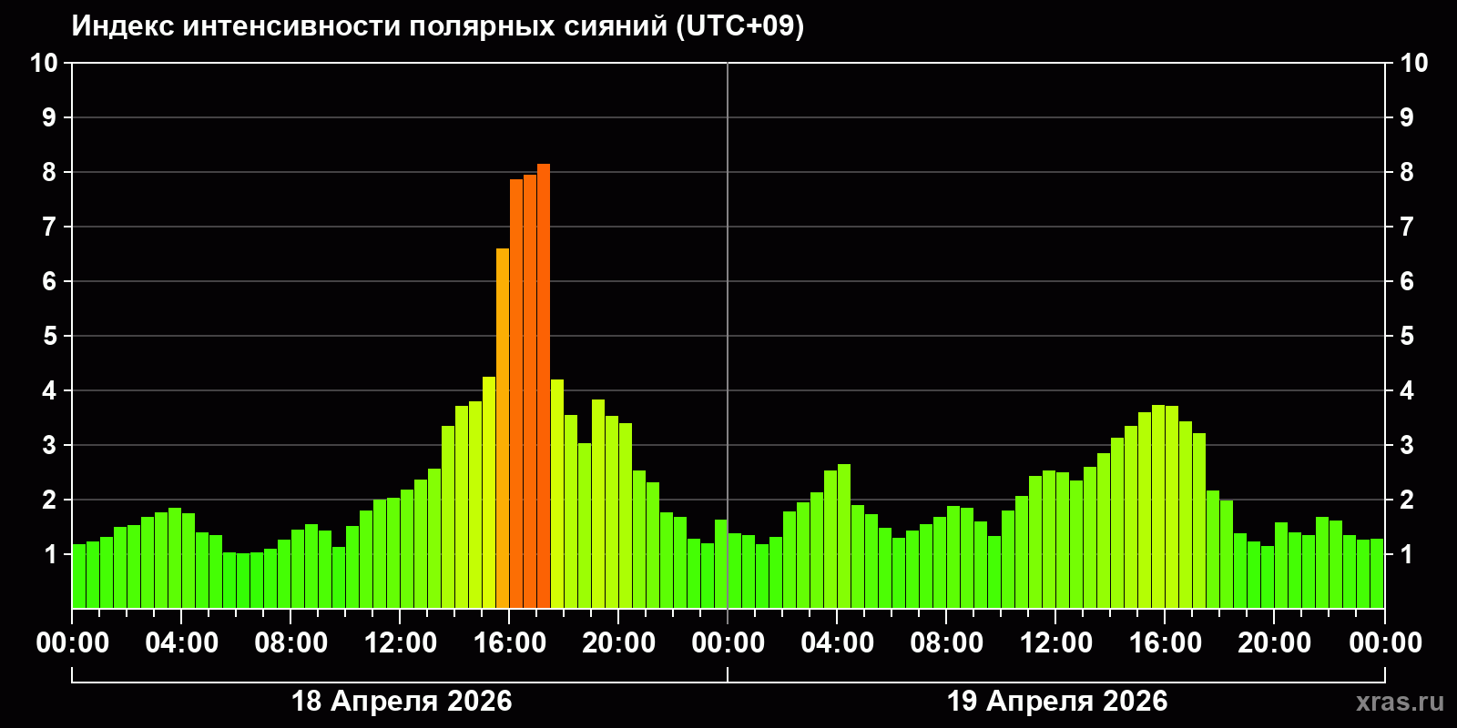 Изменения индекса интенсивности полярных сияний с 2026-04-18 по 2026-04-19 по местному времени