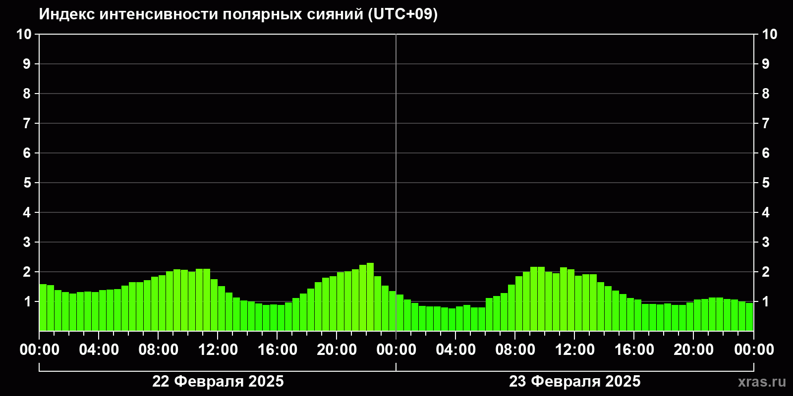 Изменения индекса интенсивности полярных сияний с 2025-02-22 по 2025-02-23 по местному времени