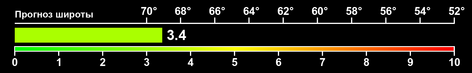 Индекс интенсивности полярных сияний и теоретически возможная широта наблюдений для ночного времени в восточном полушарии по состоянию на 2026-03-08 23:46 (конец дня) по местному времени