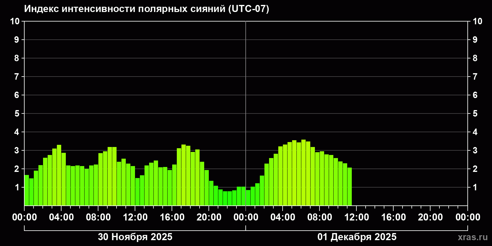 Изменения индекса интенсивности полярных сияний с 2025-11-30 по 2025-12-01 по местному времени
