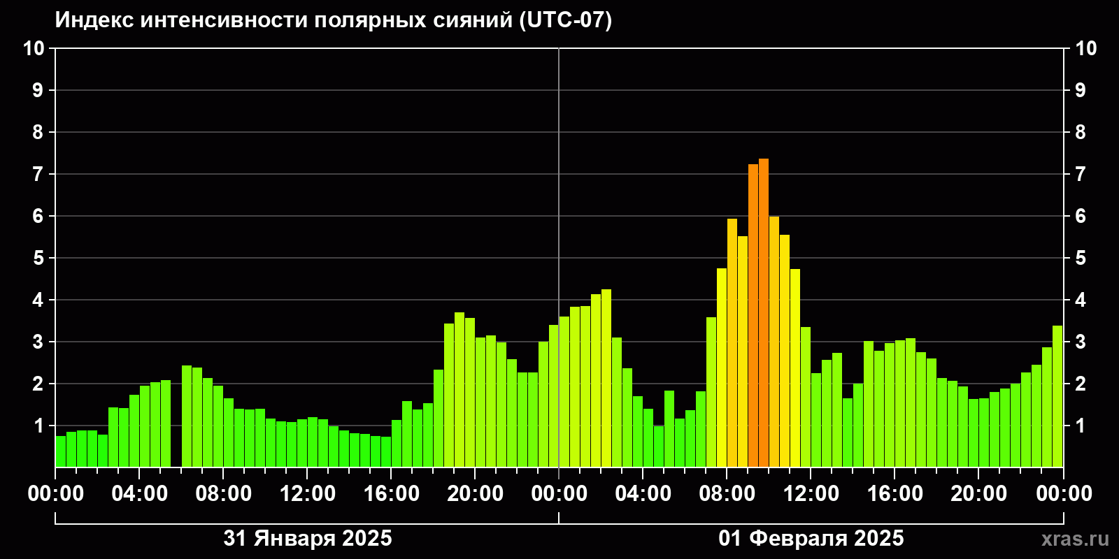 Изменения индекса интенсивности полярных сияний с 2025-01-31 по 2025-02-01 по местному времени