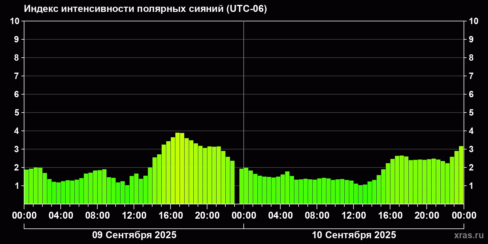Изменения индекса интенсивности полярных сияний с 2025-09-09 по 2025-09-10 по местному времени