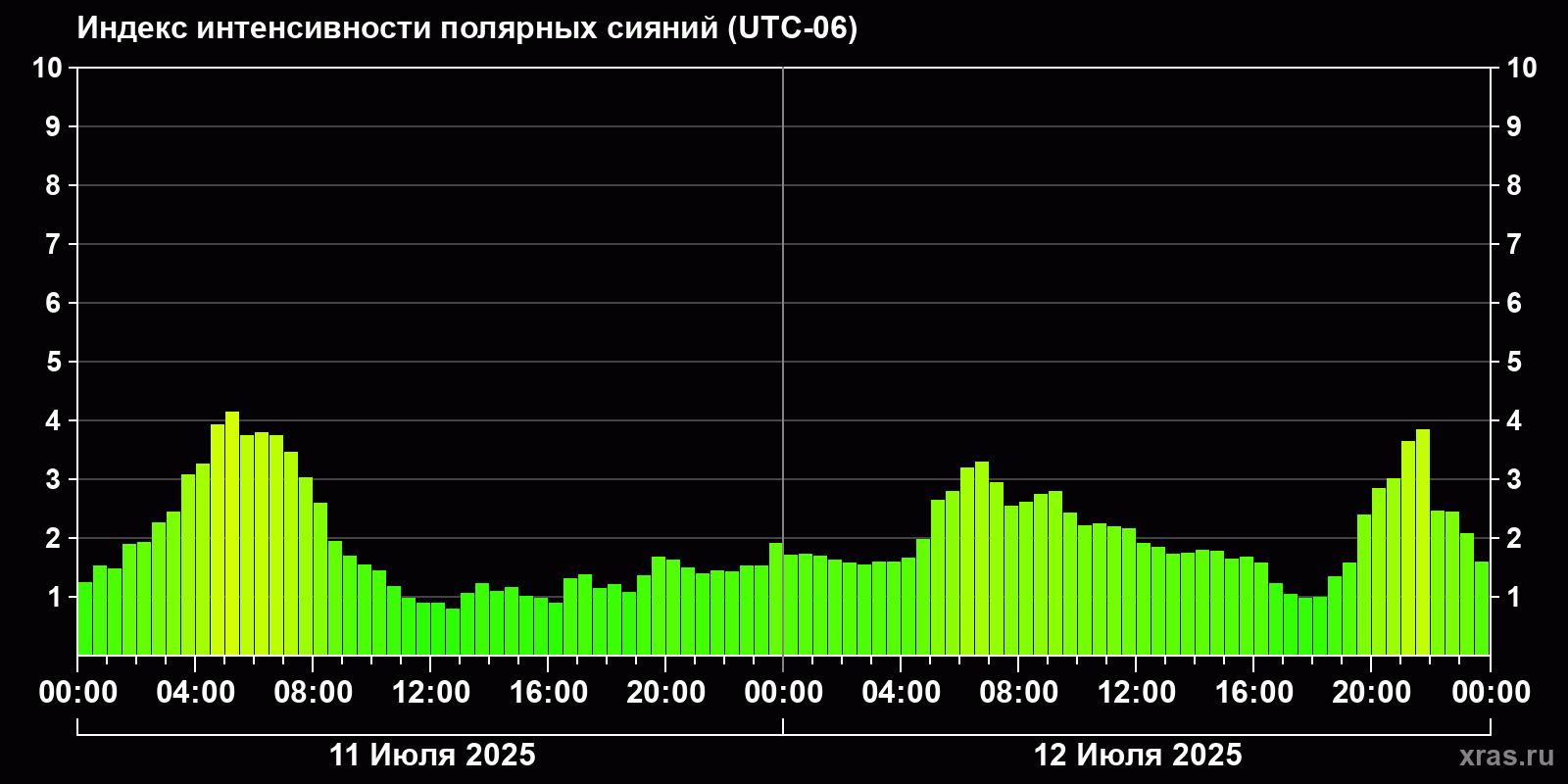 Изменения индекса интенсивности полярных сияний с 2025-07-11 по 2025-07-12 по местному времени