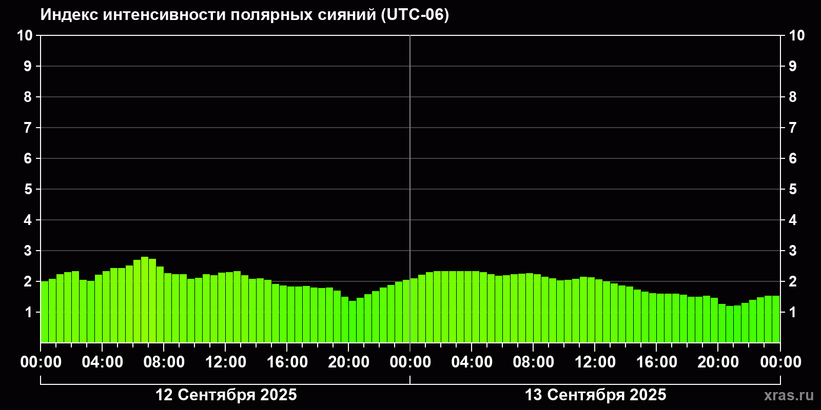 Изменения индекса интенсивности полярных сияний с 2025-09-12 по 2025-09-13 по местному времени