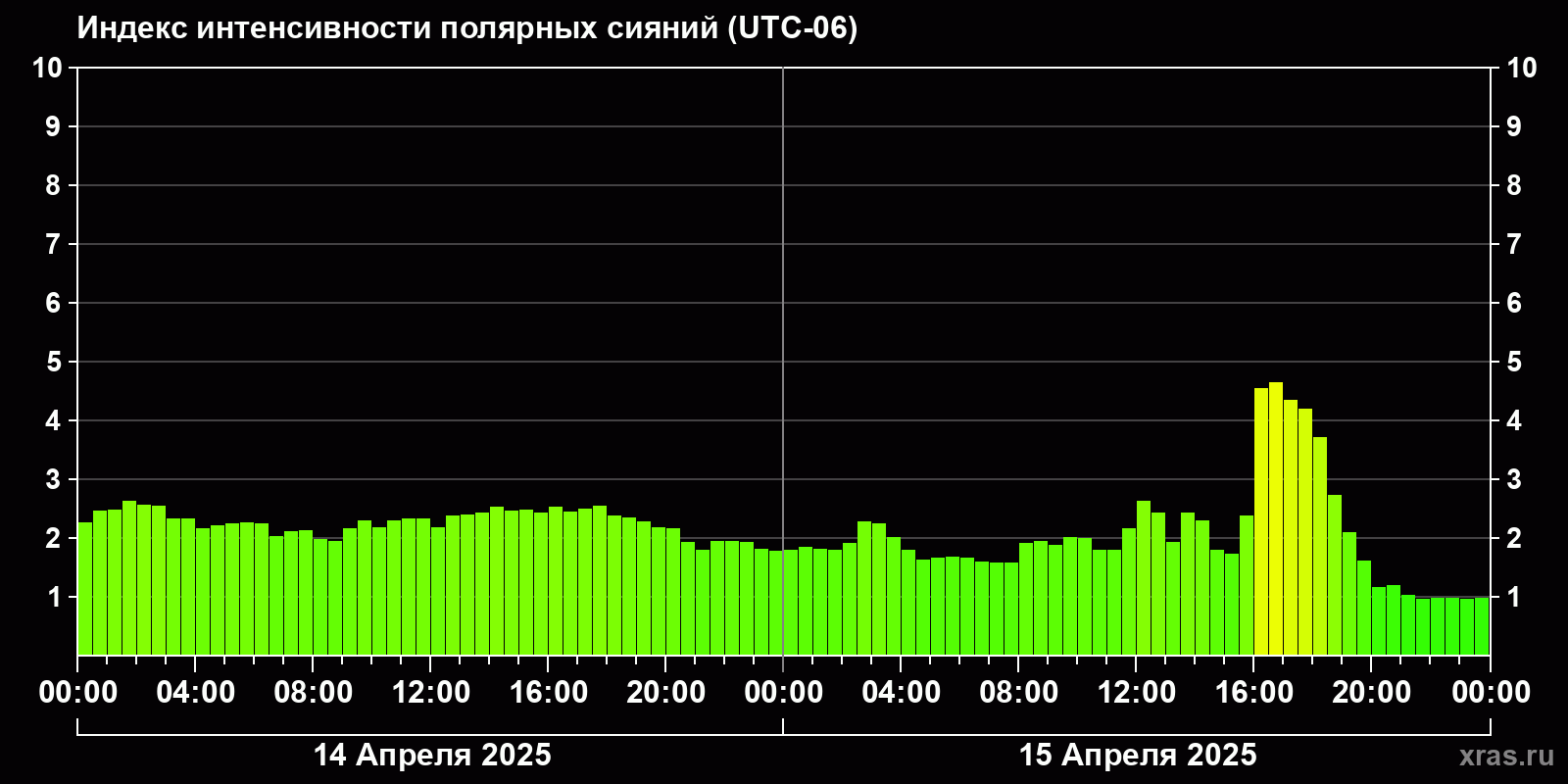 Изменения индекса интенсивности полярных сияний с 2025-04-14 по 2025-04-15 по местному времени