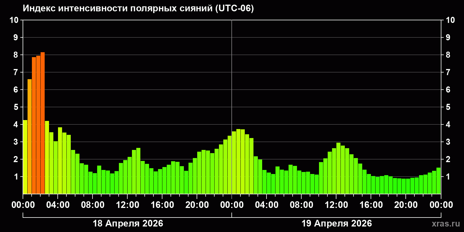 Изменения индекса интенсивности полярных сияний с 2026-04-18 по 2026-04-19 по местному времени